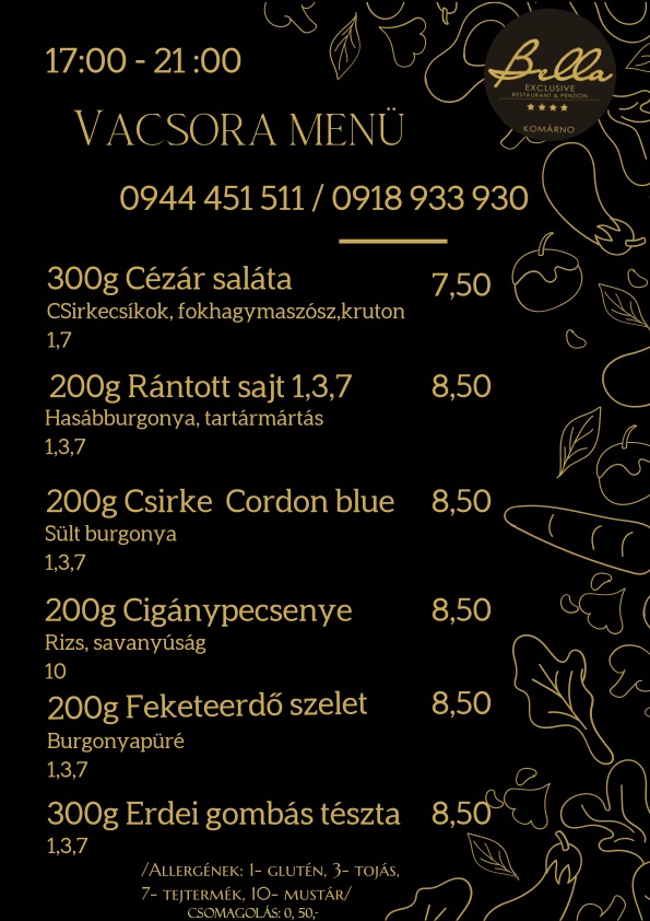 Erik Kassa-Szabó2025-02-22 Martin Červienka2025-01-16 Objednali sme denné menu, jedlo bolo výborne, polievky aj hlavné jedlo. Všetko super dochutené. Reštauráciu odporúčam. Norbert Farkas2025-01-16 Zsuzsa Pintyőke Szabó2024-12-11 Béla Molnár2024-12-08 Oleg Glushkov2024-12-07 Были в ресторане в день Святого Микалаушеса. Понравилась атмосфера зала, меню и обслуживание при подаче блюд. Брали тыквенный суп, брынзовые галушки, свиную шею в кляре и огуречный салат и к этим блюдам сухое белое вино. Всё очень понравилось. Праздник удался! Alžbeta Horváthová2024-11-26 Krisztiàn Svètecz2024-11-07 Nice owner, good conditions Eva Pinto Quintela2024-11-03 monika pilselova2024-11-01 Hodnotím restauraci ne hotel a pokoje. Restaurace krásná, obsluha pomalá. Ceny za jídlo vysoké. Kvalita jídla? Maso bylo v pořádku. Ale k tomu jsem dostala studenou bramborovou kaši snad z pytlíku. Ochutnavala jsem i jiná jídla, za mne v porovnání cena a kvalita nic moc. Tuto restauraci nedoporučujiGoogle celkové hodnotenie 4.4 z 5, na základe 554 recenzií
